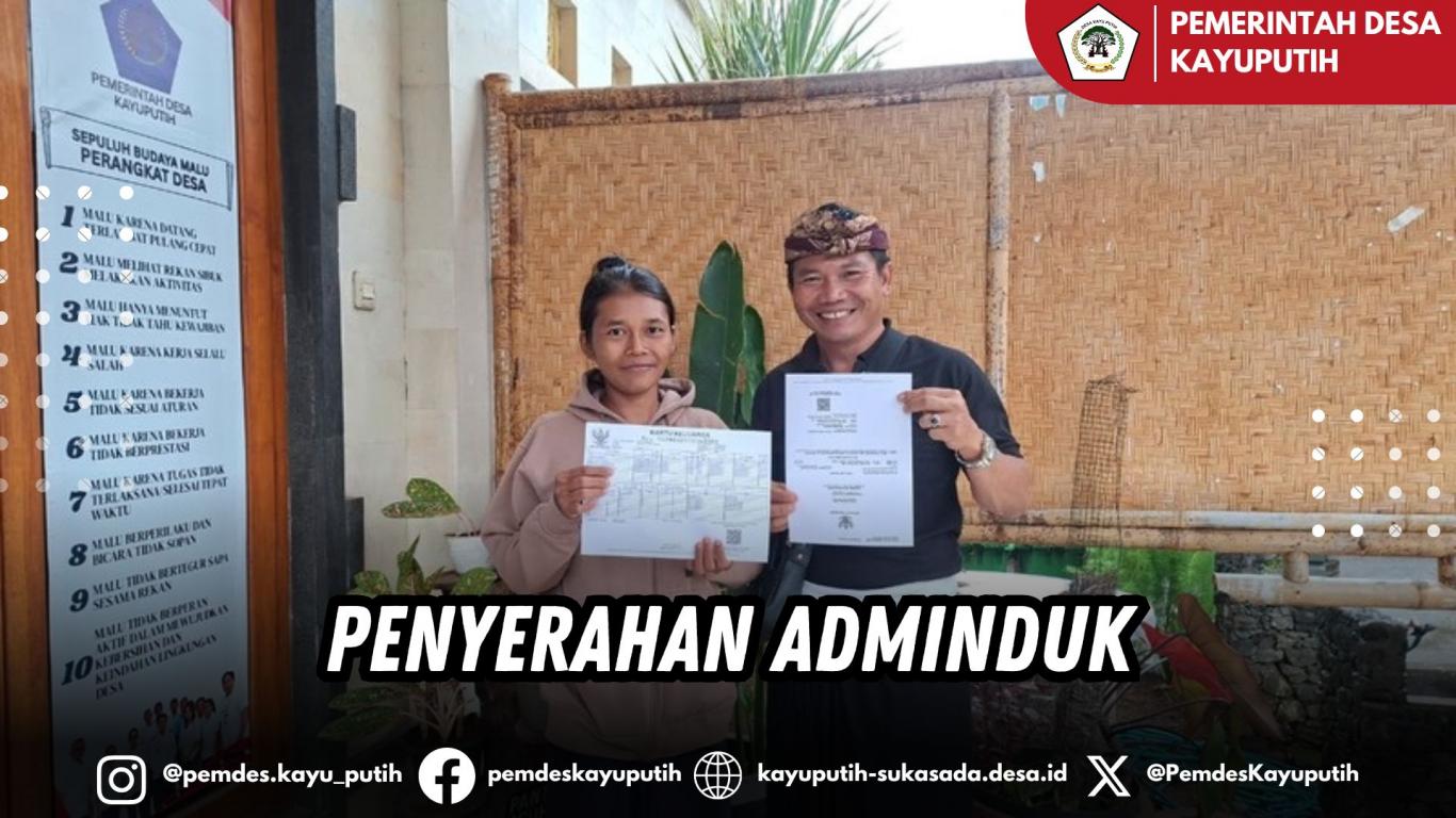 Mewakili Perbekel Kayu Putih. kasi pemerintahan menyerahkan dokumen kependudukan berupa KK an. Ketut Sumerta dan Akta Kelahiran an. Ketut Devika Vania Putri. Banjar dinas Melaka, Desa Kayu Putih, Kabupaten Buleleng